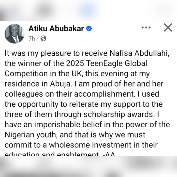 The former presidential candidate of the Peoples Democratic Party, Atiku Abubakar stated on his verified Facebook page on Thursday; “It was my pleasure to receive Nafisa Abdullahi, the winner of the 2025 TeenEagle Global Competition in the UK, this evening at my residence in Abuja.”