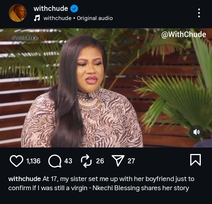 The actress also spoke about how her sister had doubted her virginity and her sister went as far as setting her up with her boyfriend, just to confirm if Nkechi Blessing was actually a virgin or not.